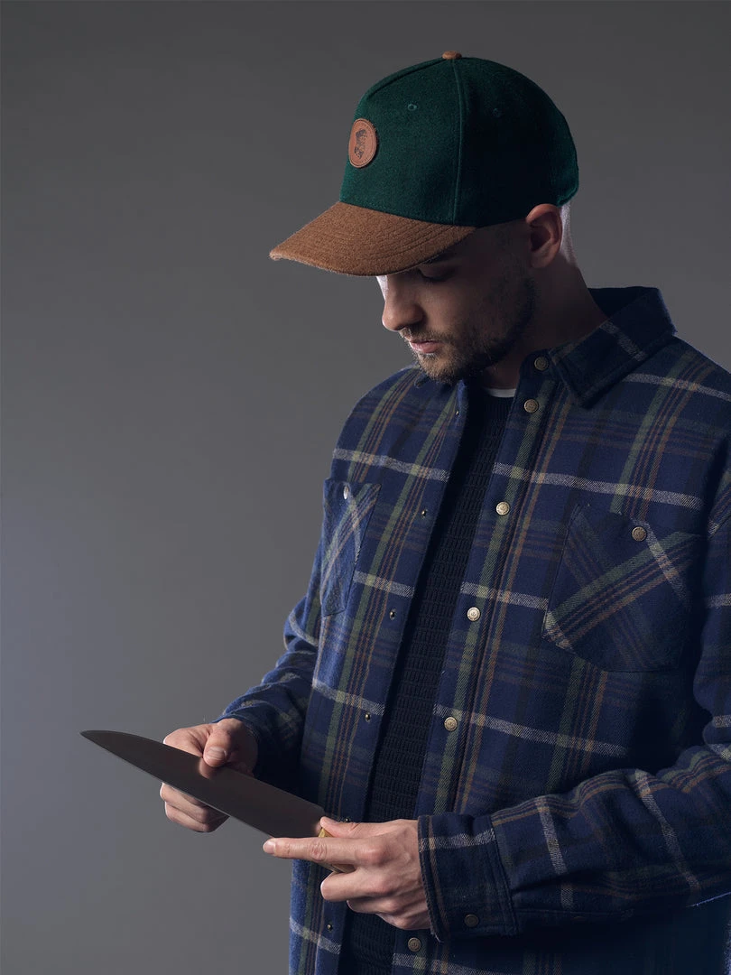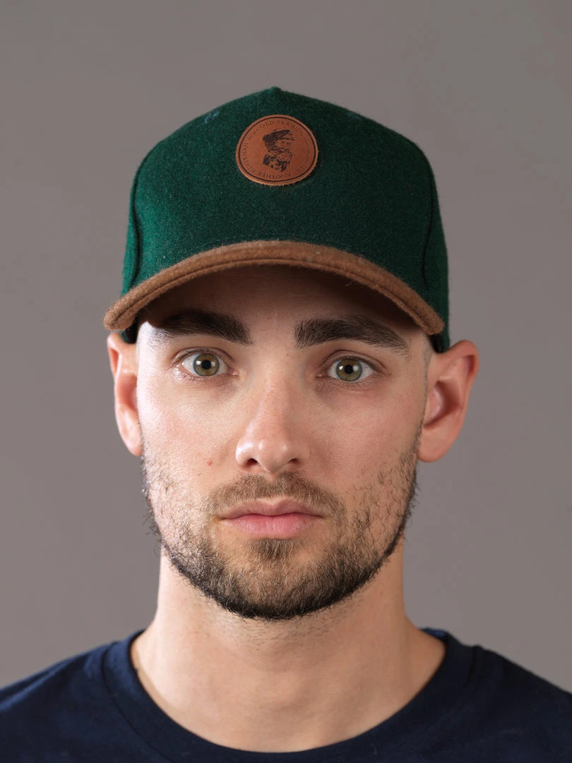 Warming up our caps this winter season with the Wool Dog Cap. Features a pre-curved bill and an old sea dog leather patch on the front.Â
